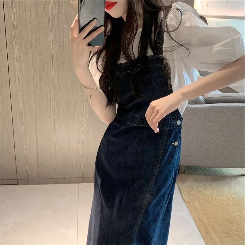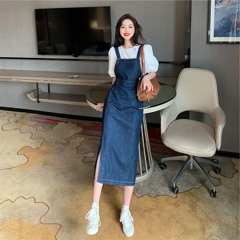 Women's Summer Fashion Side Split Dress Korean Edition Casual Denim Strap Dress Versatile Thin And Small Design Long Dress